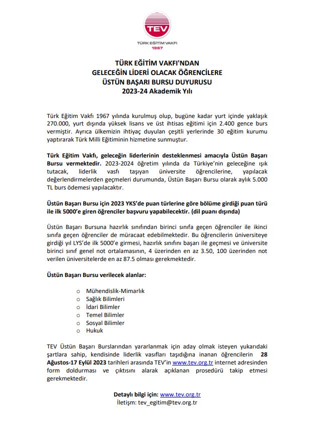 Türk Eğitim Vakfı Üstün Başarı Burs Duyurusu